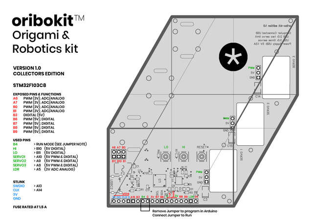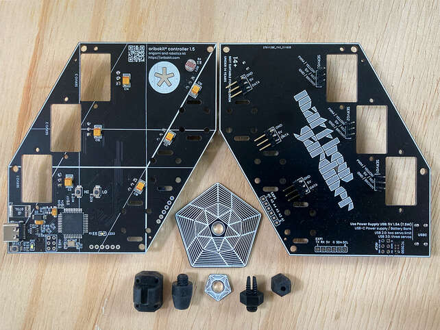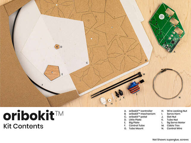 oribokit® includes 1,2 or 3 oribotic blossoms featuring easy to fold laser-cut paper, servo motors, drive wires, and Arduino compatible microcontroller plus open-source firmware.
